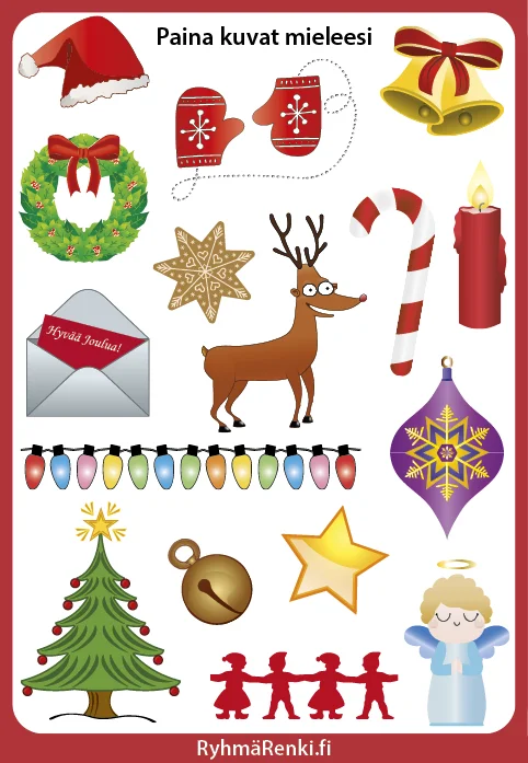 Tulosta tehtäviä. Osallistujat voivat katsella kuvia muutaman minuutin ajan. Tämän jälkeen jokainen voi kirjoittaa paperille tai muistella vaikka parin kanssa, mitä kuvia sivulla oli. Lisää haastetta saa, kun antaa tehtäväksi muistella kuvien yksityiskohtia tai keksiä jouluisia asioita, joita ei ollut mukana.